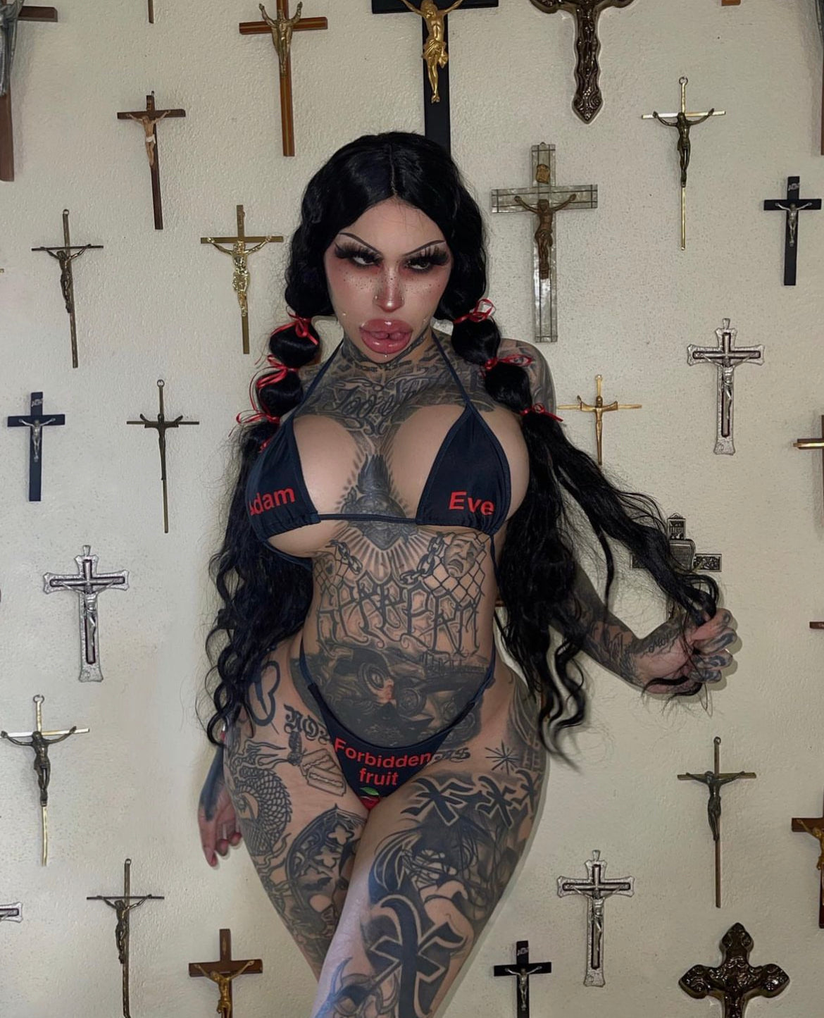 Person with tattoos wearing a black and yellow outfit with visible text on a dark background