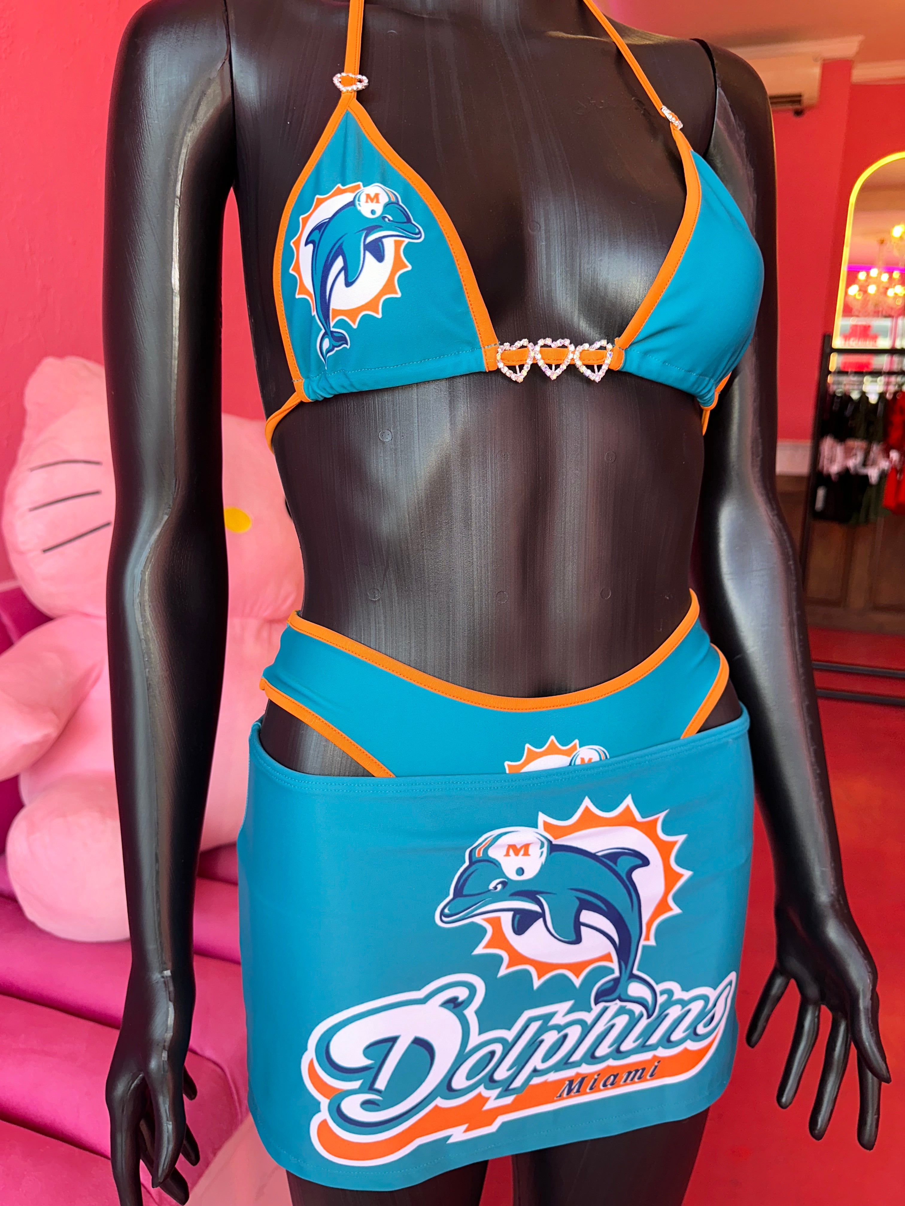 Bikini set with rhinestone detail top and high rise thong + stretchy body forming mini skirt set.