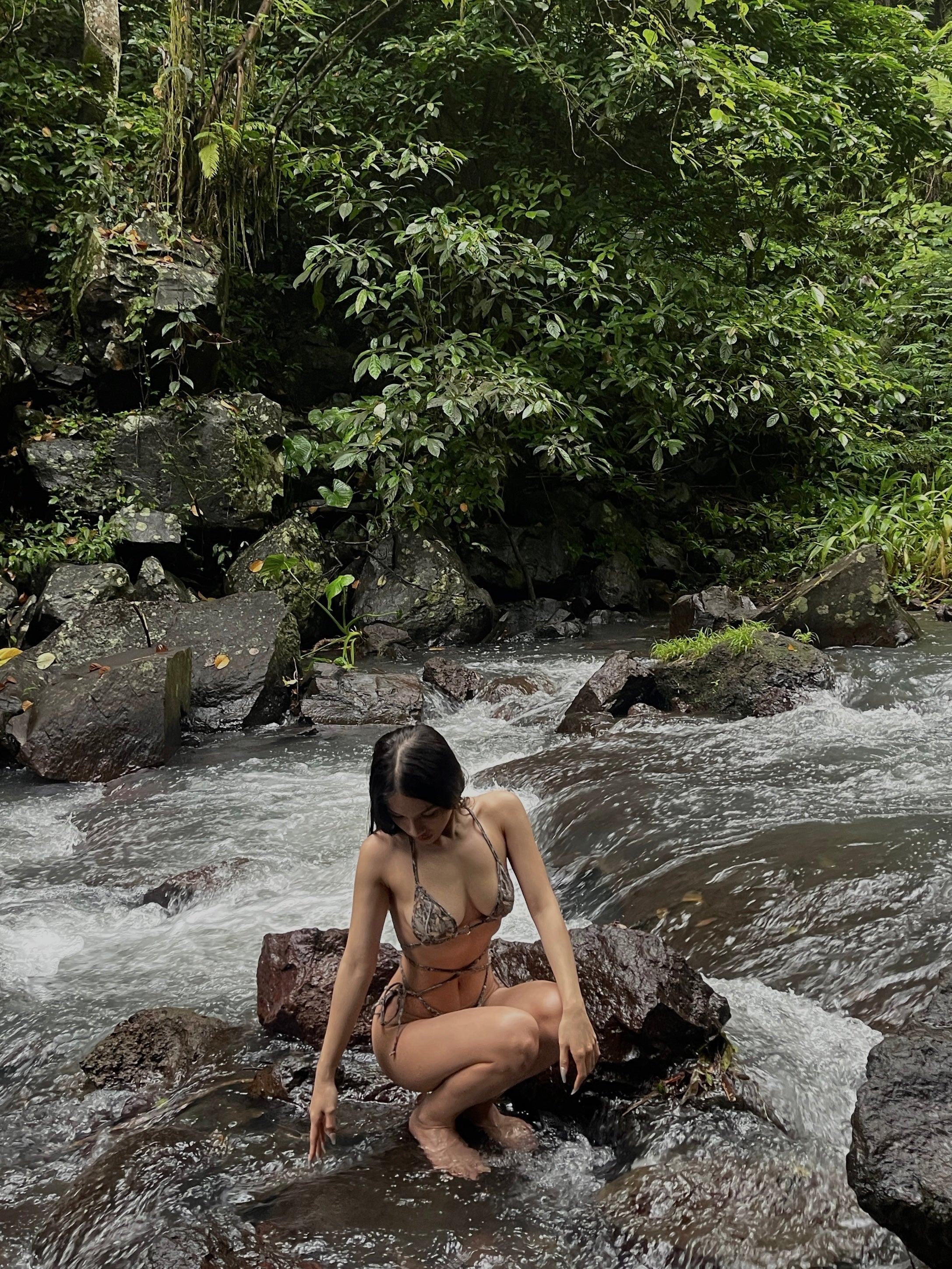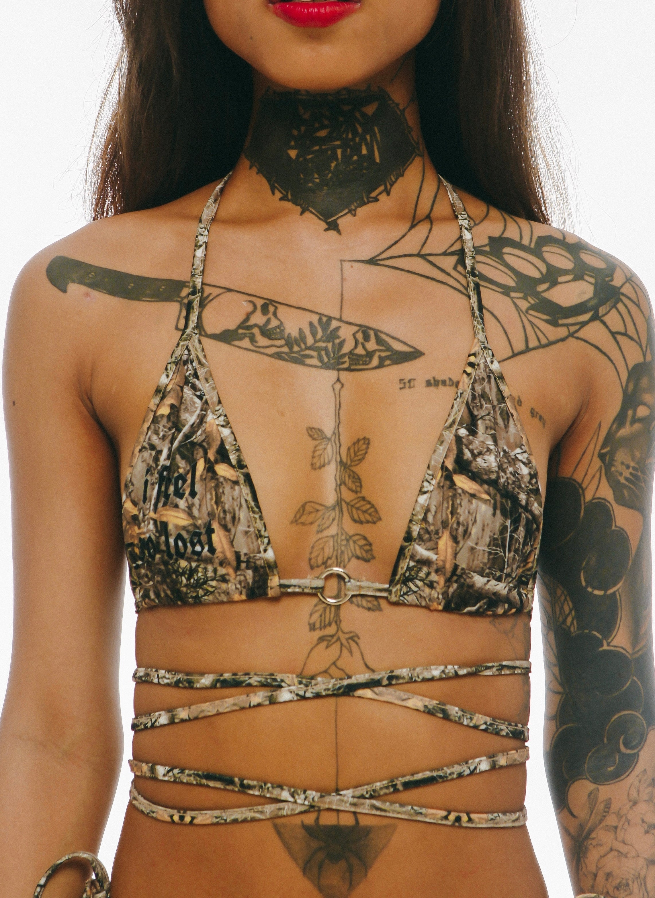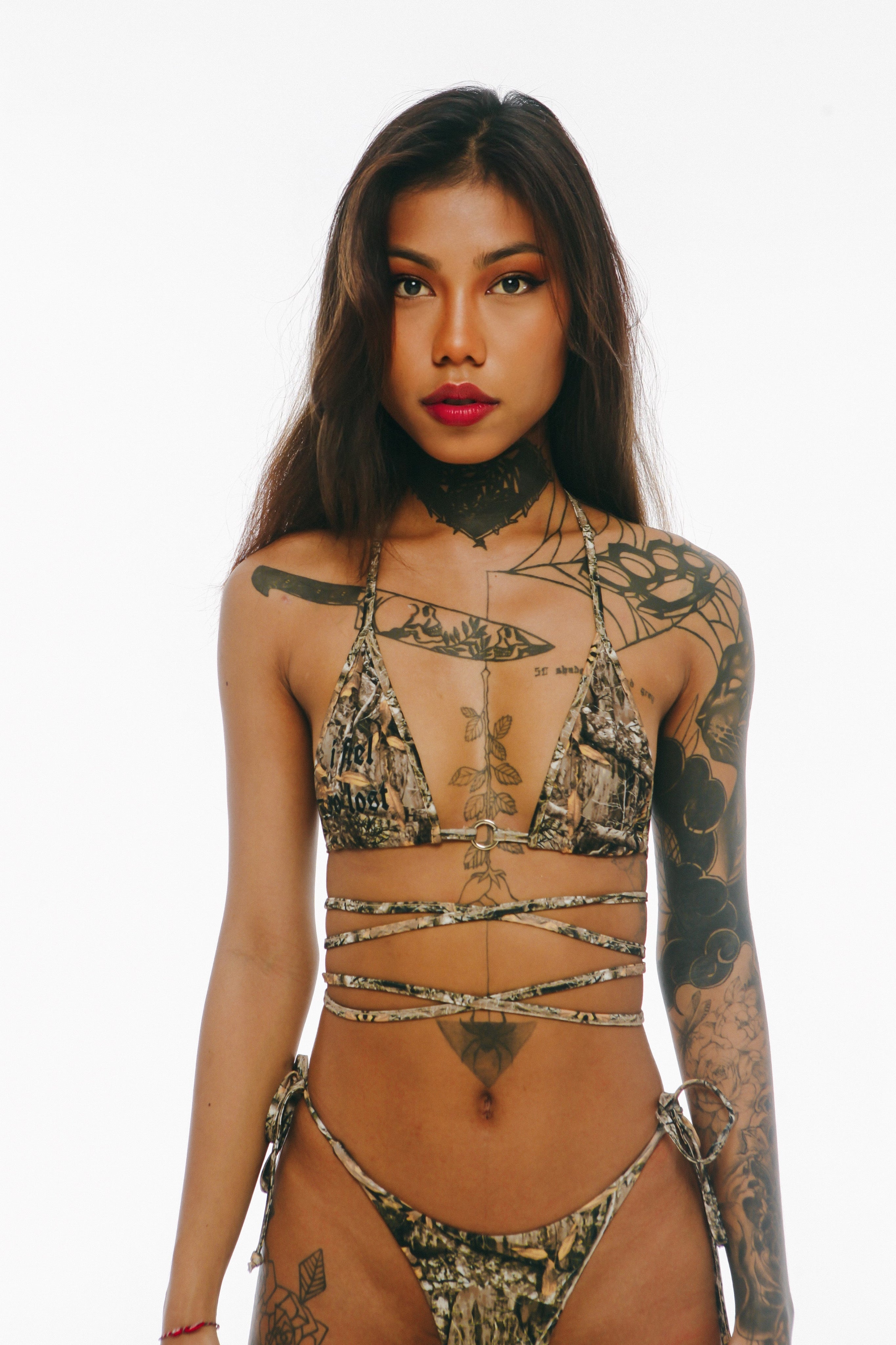 For those who are lost. Sleek cut top with wrap around straps and cheeky, high rise side tie cut bottoms. Double lined for swim.